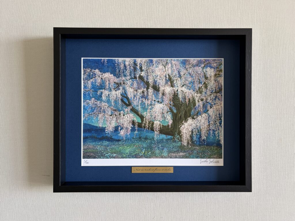 ル・サロンでの展示タイトル「Nuit où tombent fleurs et étoiles」のゴールドプレートを添え、署名と10部限定であることを示す通し番号を表記してお届けします。