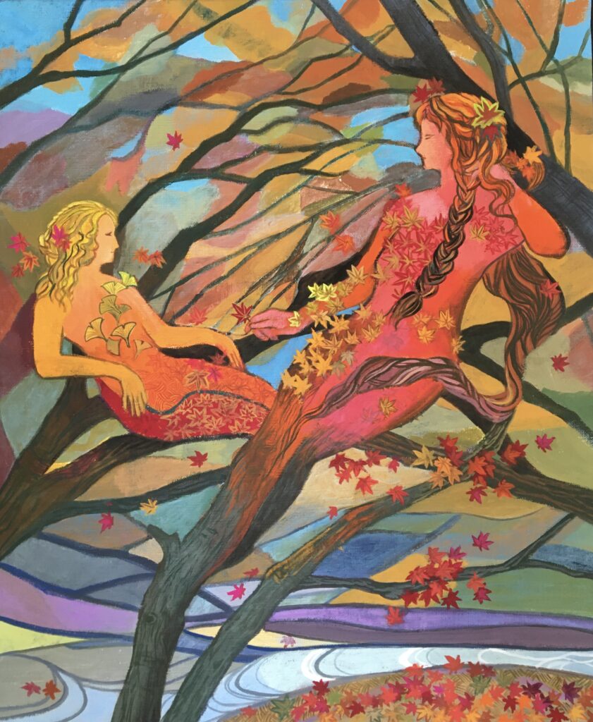 紅葉の美しい並木道を見ているうちに、もみじの精がお喋りを愉しんでいるように見えて、この構図が思い浮かびました。