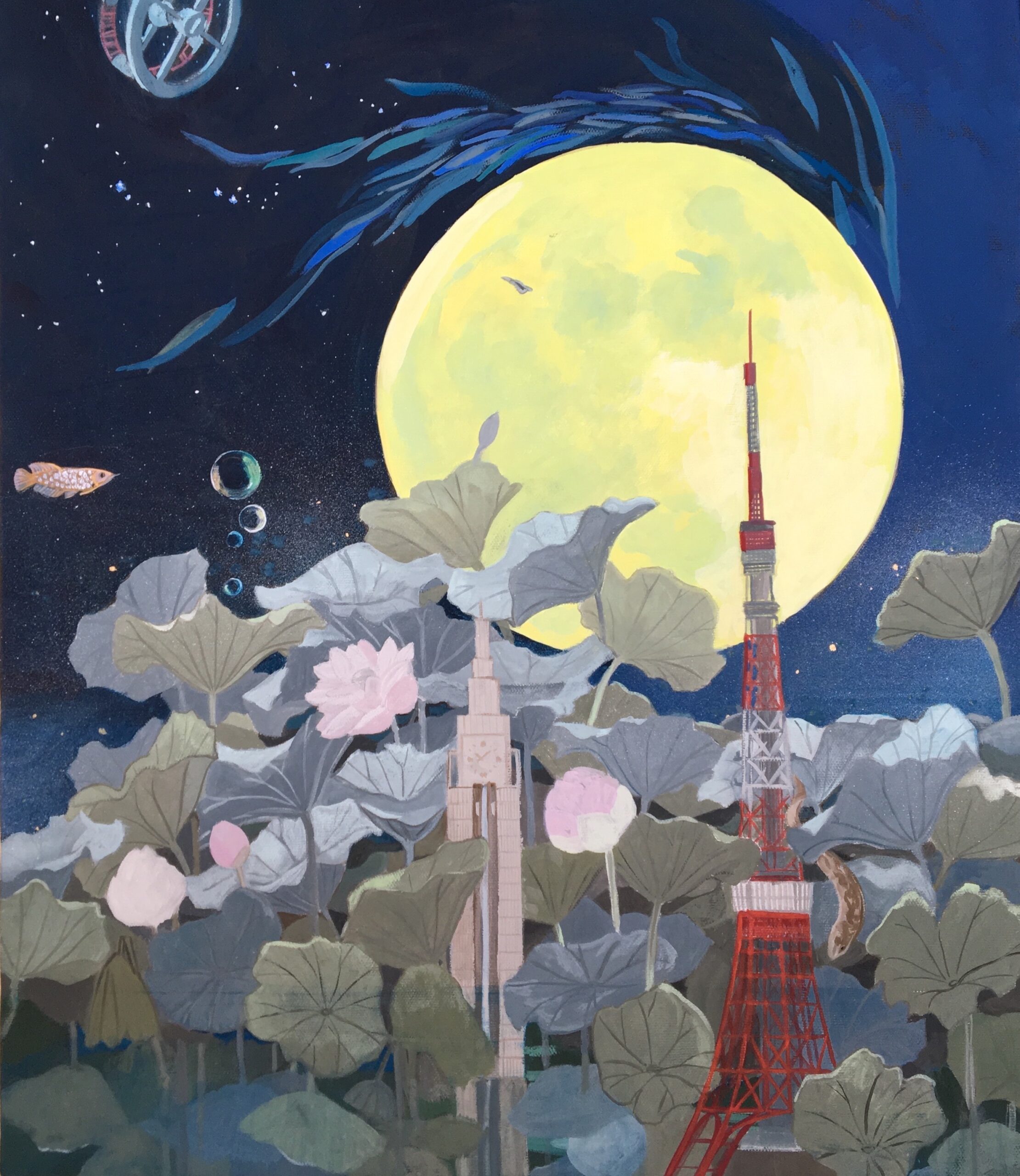 In this canvas I wanted to join the past, present, and my imagination of the future in Tokyo.