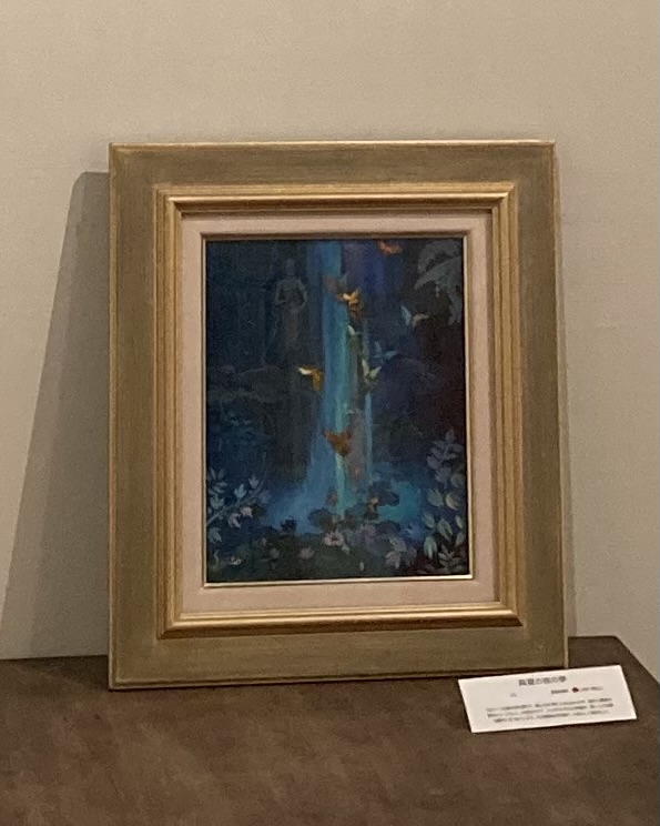 When I first painted a composition of the same name and butterfly motif,  I was deeply moved by the imagery of ruins, their walls marked with ornamental reliefs that were slowly crumbling under time’s touch.  A statue of a Buddhist temple goddess stands quietly in the moonlight, her quiet gaze turned to the miracle of soaring butterflies, the vessels for the souls of her predecessors. This became my focus in the smaller piece. In this piece the luminous flare rising from the bright surface of the water can also appear as a waterfall catching the reflection of the full moon, so even if the canvas is smaller, the composition can be interpreted from many different perspectives.