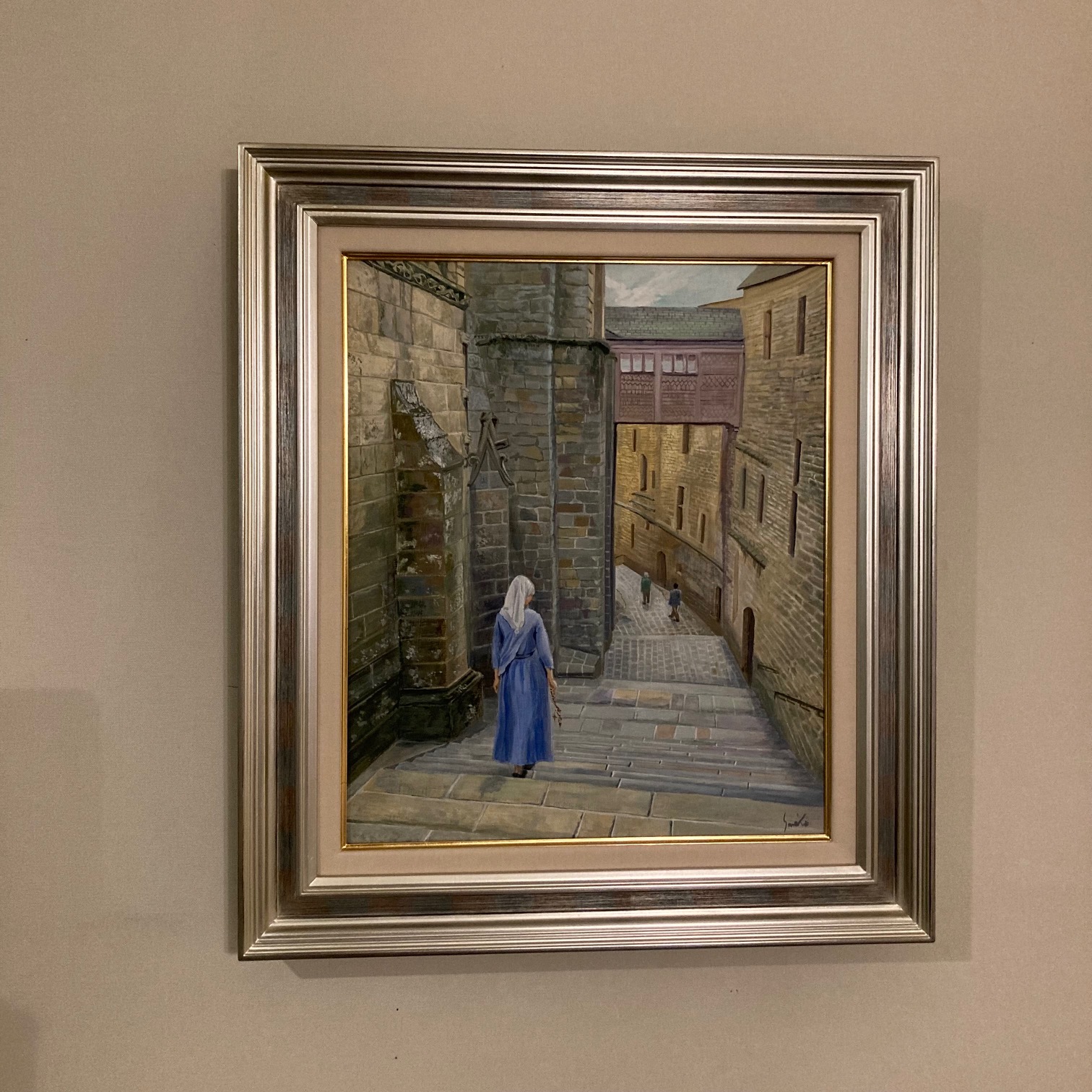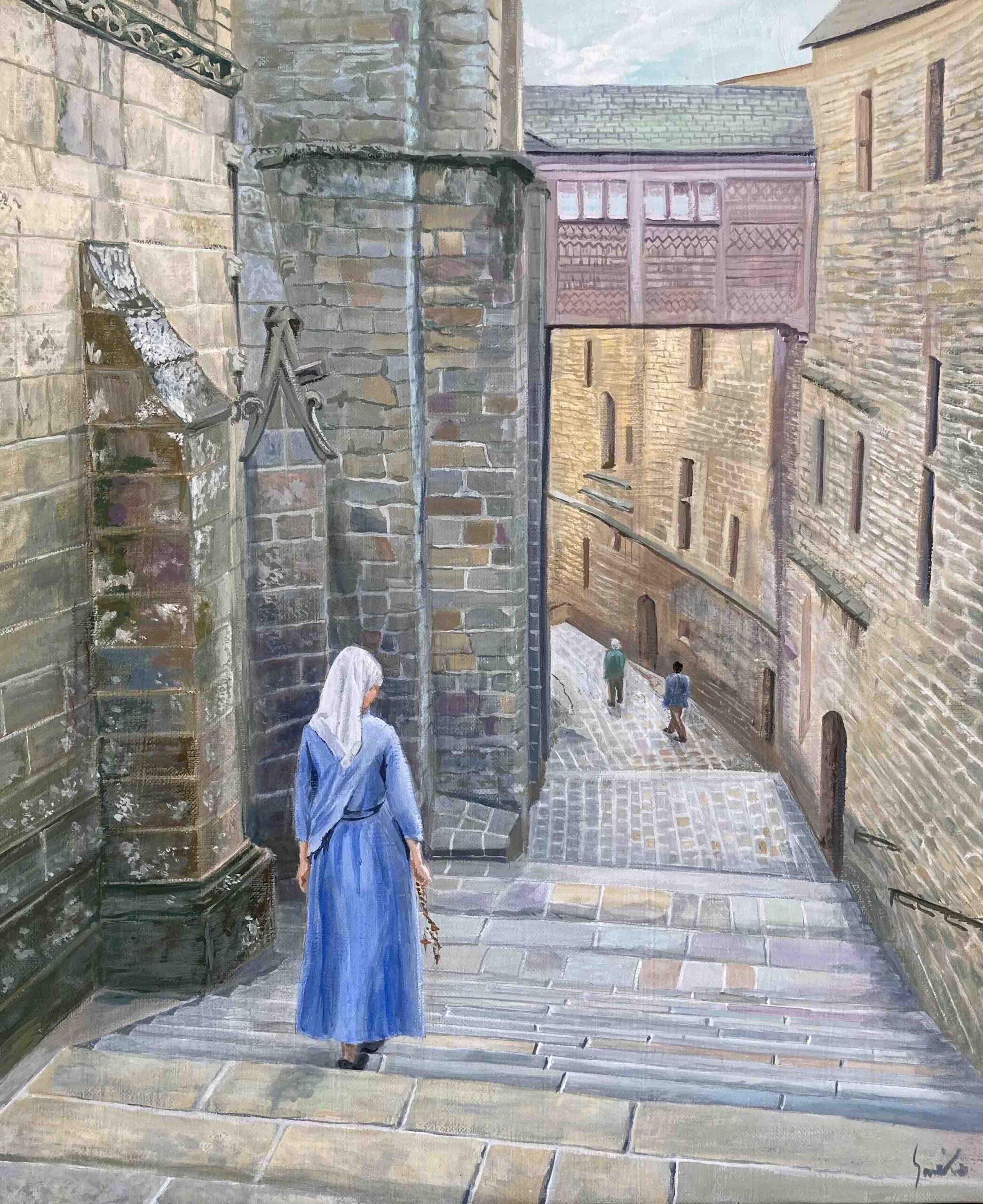 この作品を描こうと思ったきっかけは、ある方から送っていただいたモン・サン・ミシェルの写真でした。聖堂を出て、帰路につくための階段です。