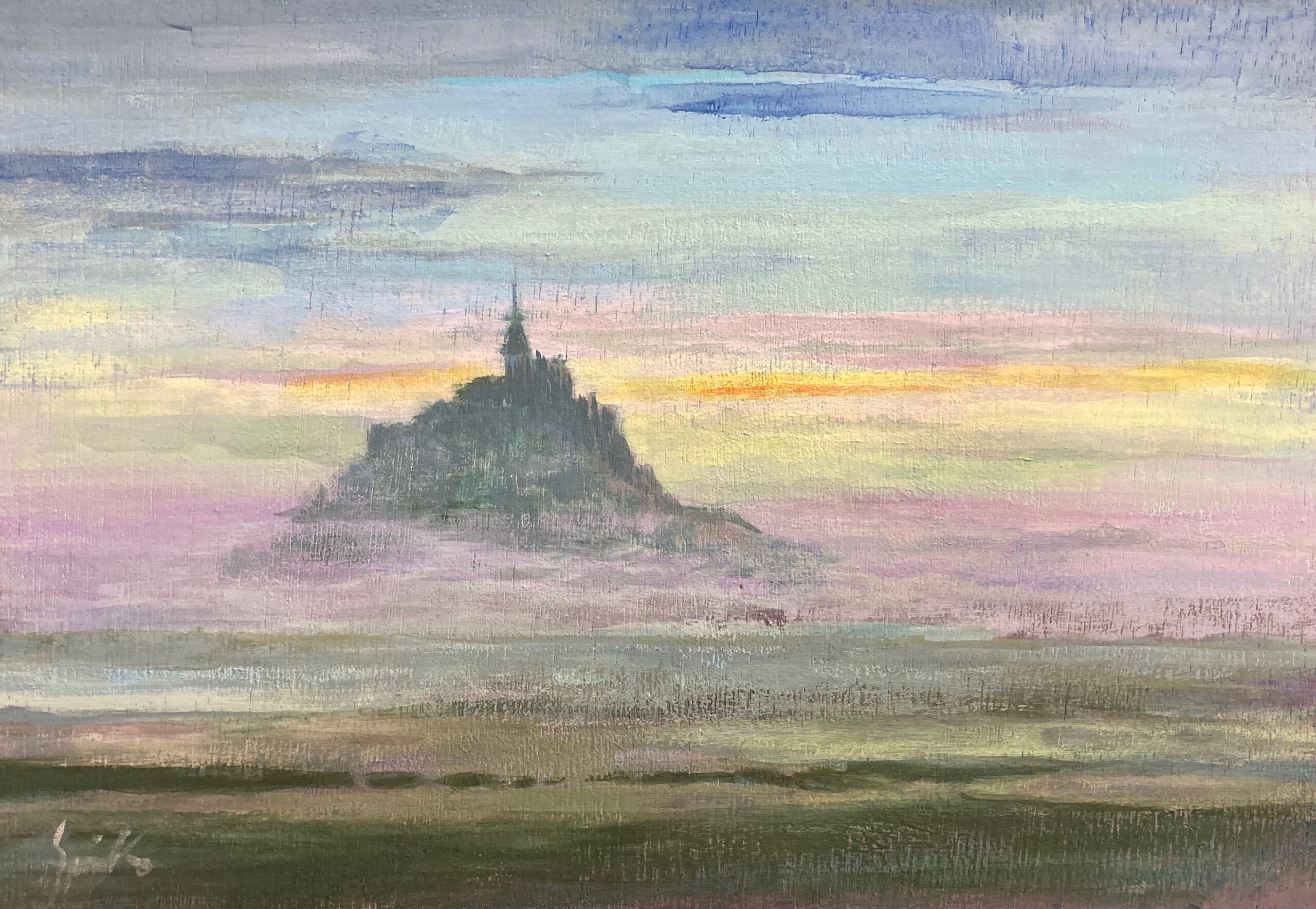 モン・サン・ミシェルを時間帯を変えて3点描きました。私が実際に訪れたのは午後ですから、朝と夜は空想を膨らませて描いています。構想を練っていた時、ある方からこんな問いかけをいただき、こんな光景が思い浮かびました。
